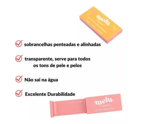 Gel Para Sobrancelha Modelador 24Un - Melu By Ruby Rose DescriçãoGel modelador para sobrancelhas Melu by Ruby Rose,é um gel incolor para quem ama deixar os fios das sobrancelhas bem alinhados porque ele mantém os fios fortalecidos e penteados por mais tempo, Esse gel de sobrancelhas é perfeito para você deixar o olhar bem marcante, O Gel de Sobrancelhas Melu, é um gel incolor para sobrancelhas que proporciona o efeito temporário de brow lamination que consiste em deixar os fios da sobrancelha alinhados para cima, dando a impressão de sobrancelhas mais grossas, cheias e levantando o olhar! A sua textura macia deixa a aplicação super fácil com fios alinhados e cheinhos. Sobrancelhas com o aspecto mais natural, modeladas e cheias!Principais benefícios:- Efeito natural- Efeito brow up- Secagem rápida- Modela, penteia e fixa os fios- Não sai na água e tem alta durabilidadeComo amolecer gel para sobrancelha ?Se sentir que o gel está duro na hora de utilizar, basta molhar o pincel antes de passar no produto.Como usar gel para sobrancelha: Antes de tudo molhe um pouquinho o pincel com água, assim fica mais fácil de passar no produto. Aplique o gel com ajuda da escovinha nas sobrancelhas no sentido do crescimento dos fios. Caixa Contém:-24 Unidades-10g Cada Imagens Meramente Ilustrativas. Todas as Informações Divulgadas são de Responsabilidade Exclusiva do Fabricante/fornecedor.