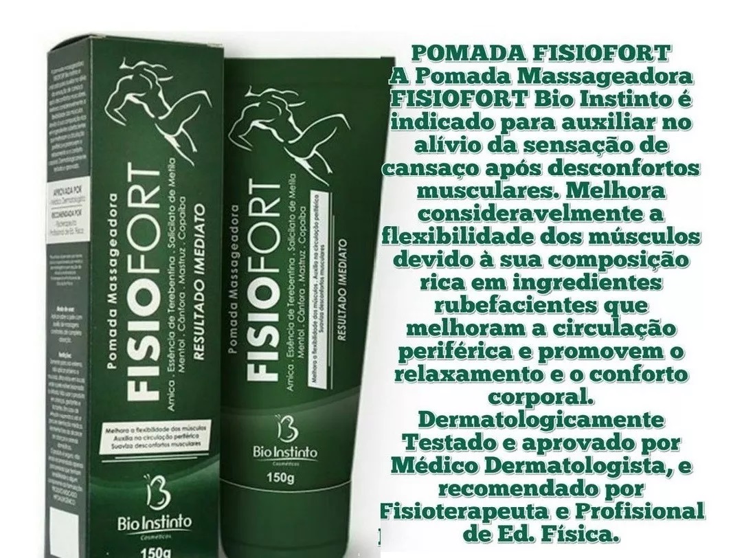 Pomada Massageadora Fisiofort 150Gr 1Un - Bio Instinto Fisiofort É Uma Pomada Massageadora Indicada Para Auxiliar No Alívio Da Sensação De Cansaço Após Desconforto Musculares.Benefícios Fisiofort Pomada Massageadora:- Promove Aquecimento Na Área Da Aplicação, Deixando Uma Agradável Sensação De Calor;- Melhora Consideravelmente A Flexibilidade Dos Músculos Devido A Sua Composição Rica Em Ingredientes Rubefacientes Que Melhoram A Circulação Periférica E Promovem O Relaxamento E O Conforto Corporal. Ação Desodorante Por 12 Hrs.Contém: Arnica, Essência De Terebentina, Salicilato De Metila, Cânfora, Mentol, Copaíba, Mastruz.Modo De Usar:Modo De Uso: Aplicar Sobre A Pele Com Auxílio De Massagens Constantes Até Completa Absorção. A Bio Instinto Oferece Uma Variedade De Produtos Para Os Cuidados Do Corpo. Se Você Deseja Proteger Sua Pele E Mantê-La Saudável, Essa É Uma Boa Opção.- Quantidade: 1 Pomada 150gr. Imagens Meramente Ilustrativas. Todas as Informações Divulgadas são de Responsabilidade Exclusiva do Fabricante/fornecedor.