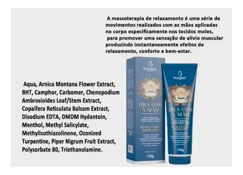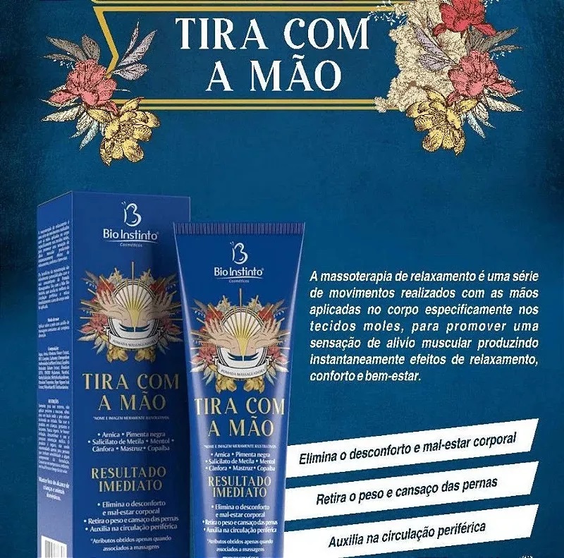 Pomada Massageadora Tira Com A Mão 150gr 1Un – Bio Instinto Pomada Massageadora Tira Com Mão Tem Resultado Imediato, Elimina O Desconforto E Mal-estar Corporal, Retira O Peso E Cansaço Das Pernas, Auxilia Na Circulação Periférica.A Massoterapia De Relaxamento É Uma Série De Movimentos Realizados Com As Mãos Aplicadas No Corpo Especificamente Nos Tecidos Moles, Para Promover Uma Sensação De Alívio Muscular Produzindo Instantaneamente Efeitos De Relaxamento, Conforto E Bem-Estar. Os Benefícios Da Massoterapia São Visivelmente Potencializados Com O Uso Concomitante Da Pomada Massageadora Tira Com A Mão Bio Instinto, Que Auxilia Na Melhora Da Circulação Periférica E Relaxa Imediatamente A Área Do Corpo Onde Foi Aplicada. Tem Efeito Desodorante Prolongado E Fácil Absorção. Contém: Arnica, Pimenta Negra, Salicilato De Metila, Cânfora, Mentol, Copaíba, Mastruz. Modo De Usar:Modo De Uso: Aplicar Sobre A Pele Com Auxílio De Massagens Constantes Até Completa Absorção. A Bio Instinto Oferece Uma Variedade De Produtos Para Os Cuidados Do Corpo. Se Você Deseja Proteger Sua Pele E Mantê-La Saudável, Essa É Uma Boa Opção.- Quantidade: 1 Pomada 150Gr. Imagens Meramente Ilustrativas. Todas as Informações Divulgadas são de Responsabilidade Exclusiva do Fabricante/fornecedor.